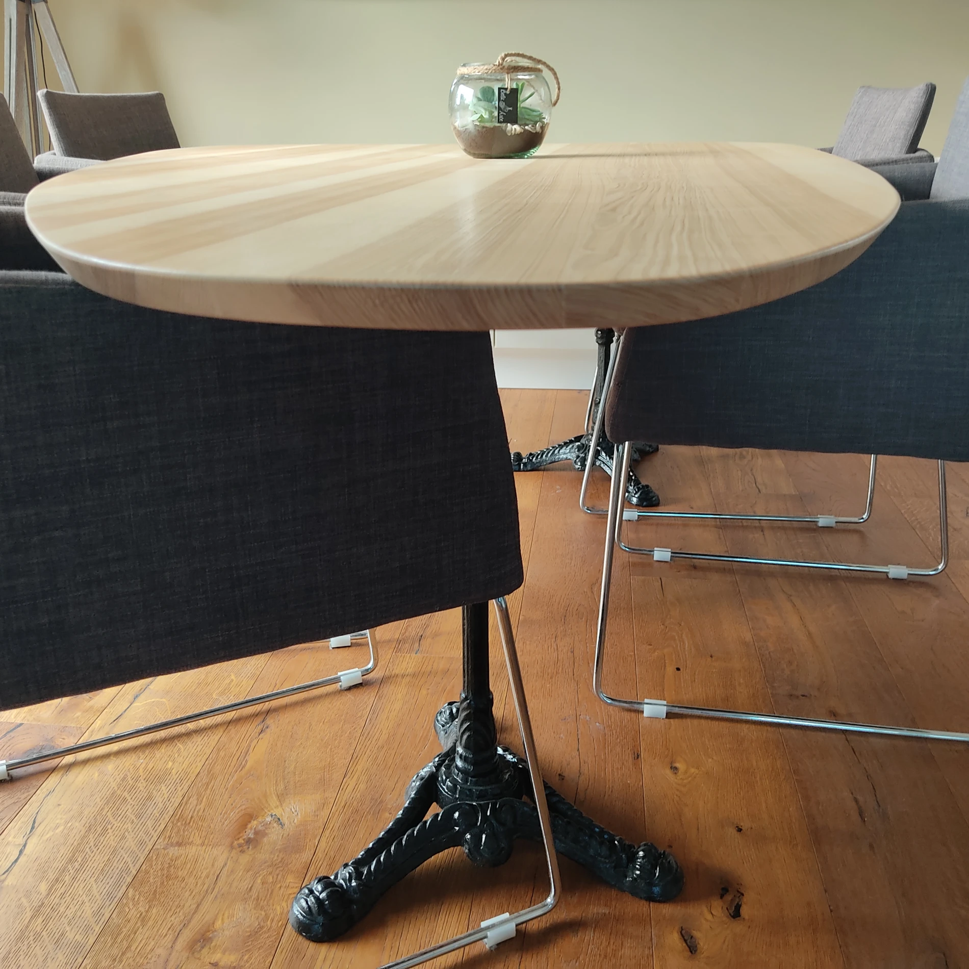 Table massif sur mesure en frêne avec des piètements en fonte.