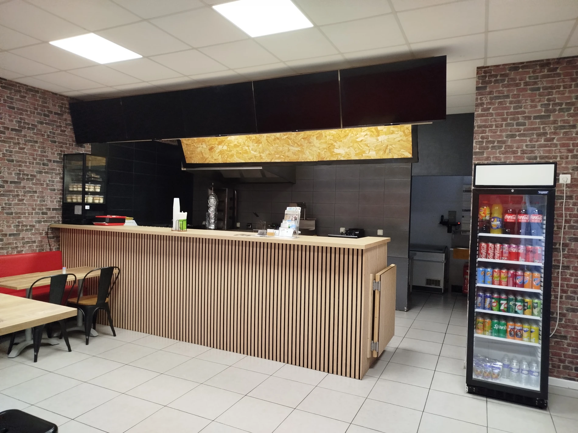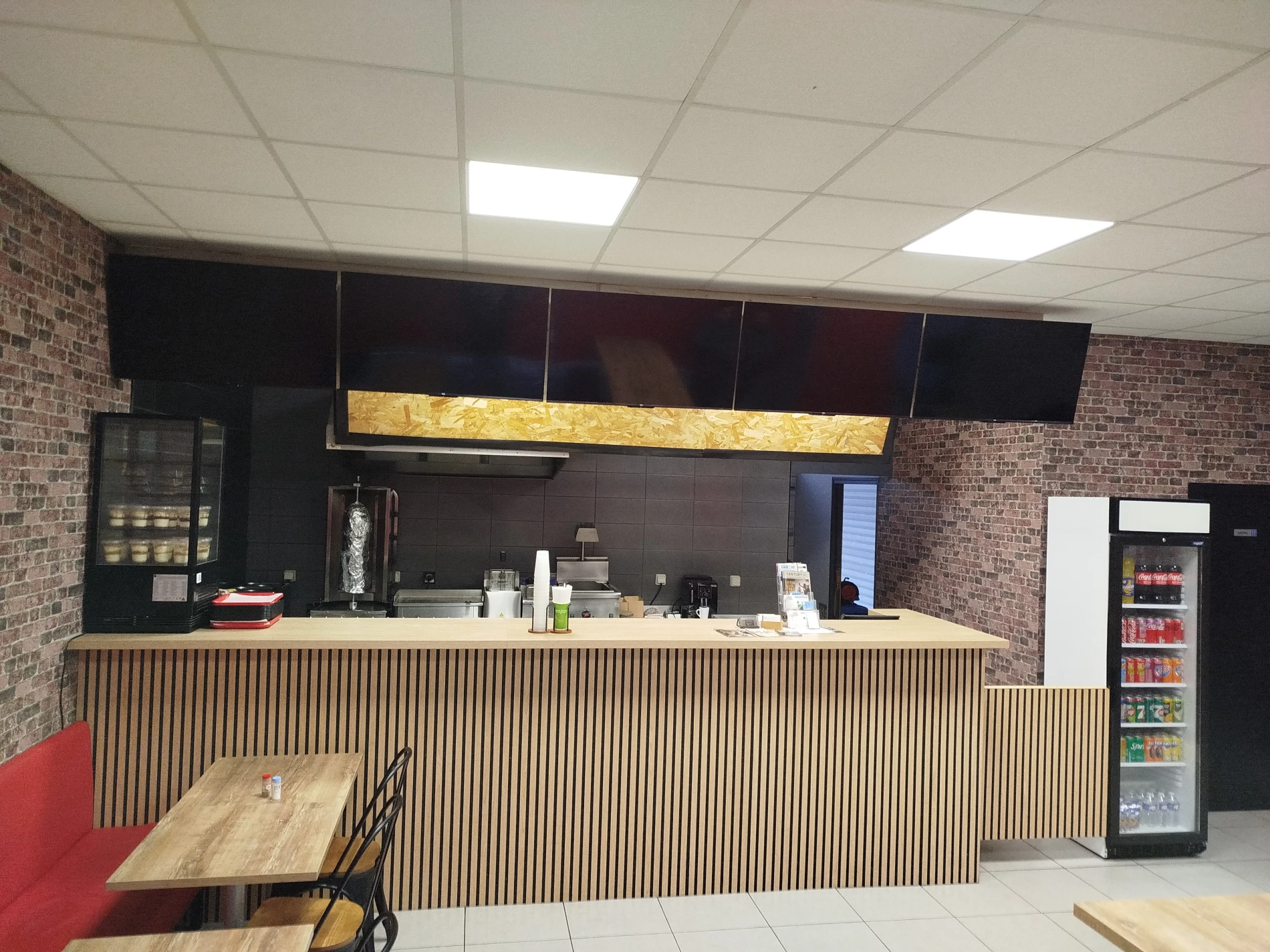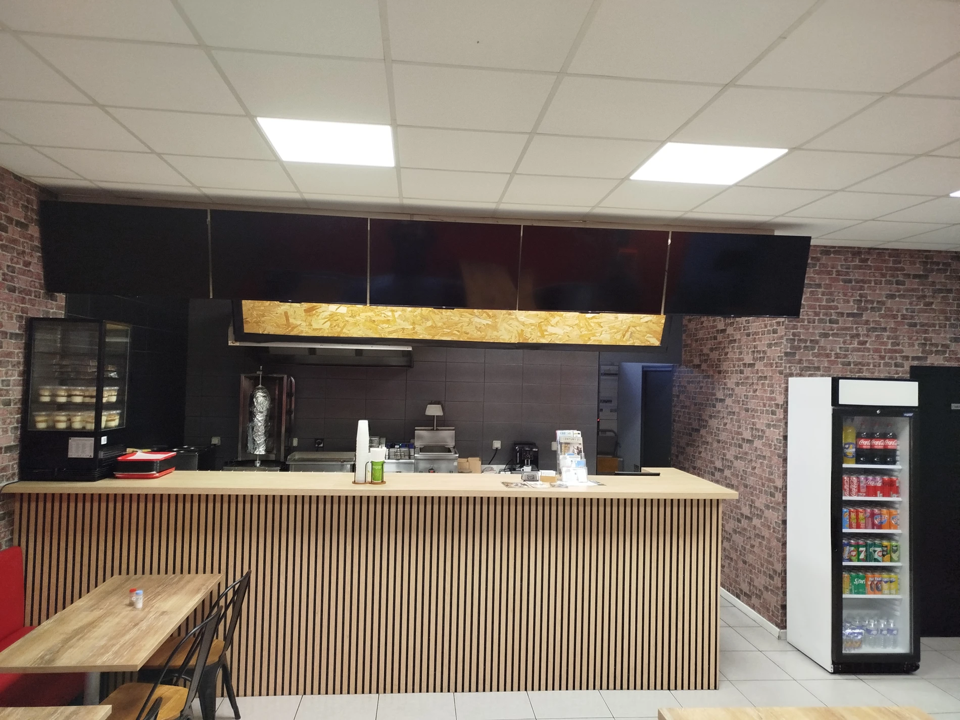 Réalisation d'un comptoir de bar sur mesure : façade en tasseaux bois, plan de travail stratifié en Chêne et habillage supérieur avec intégration des nouveaux supports TV ainsi qu'une porte battante.